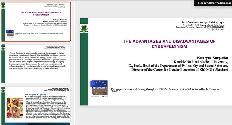 On November 15, first-year PhD students of KhNMU, as part of the study of the educational component “Philosophy of Science,” took part in the international seminar ” Interferences – Act up/Building up: EcoTechGender Action Group,” organized by the director of the Center for Women in the History of Philosophy and Science of the University of Paderborn (Germany), Professor Ruth Hagengruber, and the head of the EcoTechGender research group, Dr. Felix Grewe. The conference participants were PhD students from 7 countries around the world. The head of the Department of Philosophy and Social Sciences and director of the Center for Gender Education of KhNMU, Professor Kateryna Karpenko, was invited as the keynote speaker for the seminar.