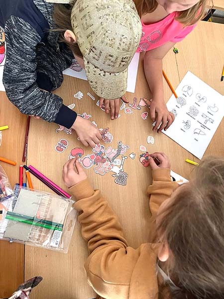 The fourth stage of the lesson was a layer-by-layer examination of the body. All the children were given pictures with a certain system of the body in section (covers, muscles, blood vessels, nervous system, internal organs, skeleton). The children formed teams and, together with the students, tried to assemble the correct sequence of layers. In the process, the children discussed and expressed themselves, coming to a joint correct decision.