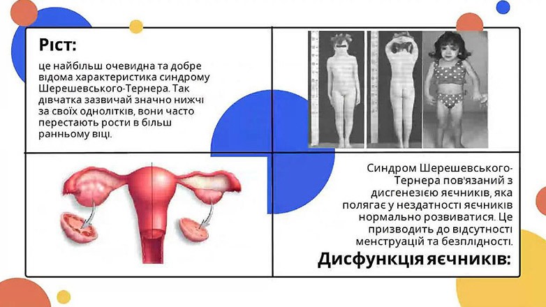 Shereshevsky-Turner syndrome (also known as 45 X or 45 X0) is a genetic abnormality in which a woman partially or completely lacks an X chromosome. This syndrome occurs in one to 2,000 and one in 5,000 women at birth. All world regions and cultures suffer equally. Generally, people with this condition have a shorter life expectancy, mainly due to heart problems and diabetes. In recent decades, the number of patients has grown faster than in the previous years of the 20th century, so it is very important to conduct educational activities among students in order to broaden their horizons.