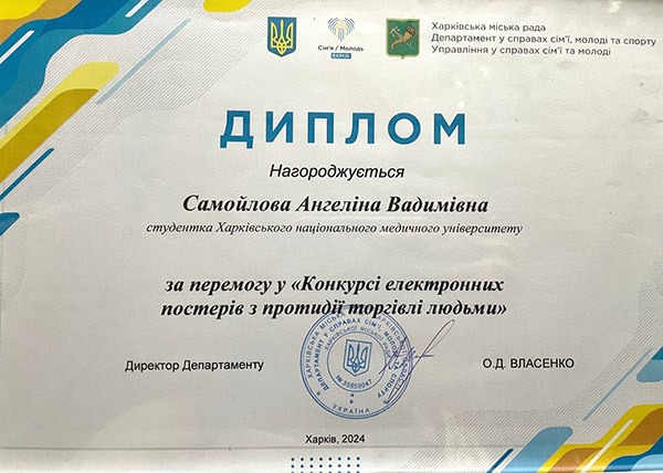 Angelina Samoilova (II Faculty of Medicine) from the sector of public education and volunteering of the Student Self-Government of KhNMU won the prize in the “Competition of Electronic Posters Against Human Trafficking”. The award ceremony took place during a round table discussion of this issue on May 2, 2024.