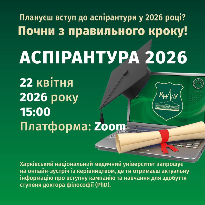 Харківський національний медичний університет запрошує на онлайн-зустріч із керівництвом, де ти отримаєш актуальну інформацію про вступну кампанію та навчання для здобуття ступеня доктора філософії (PhD).