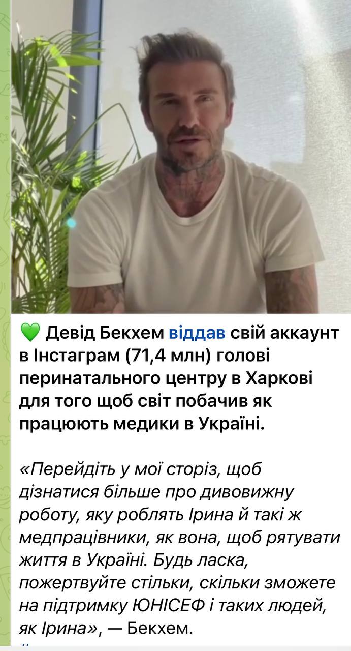 Девід Бекхем підтримав український народ, він віддав свій акаунт Інстаграм директорці Харківського регіонального перінатального центру, доцентці кафедри педіатрії № 1 і неонатології ХНМУ Ірині Кондратовій для того, щоб розповісти світу про роботу Центру під російськими бомбами.