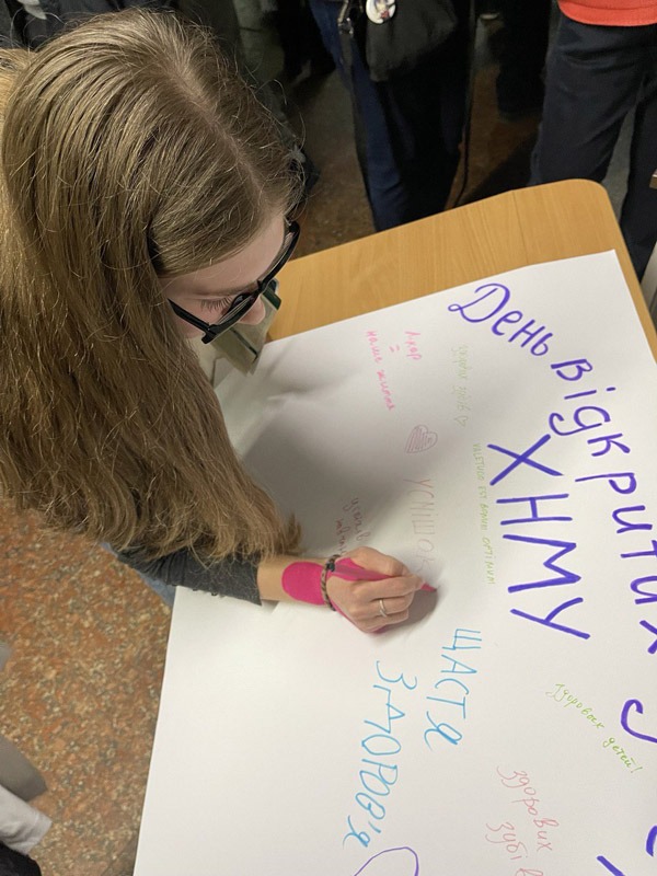 На вході перед Метрошколою для учасників було облаштовано фотозону, де школярі залюбки фотографувалися та залишали свої записи-побажання. Традиційно під час профорієнтаційних заходів медичний виш робить все, щоб учні шкіл могли детальніше ознайомитися зі спеціальностями й професіями та обрати своє майбутнє у ХНМУ.