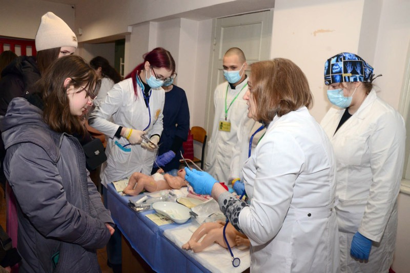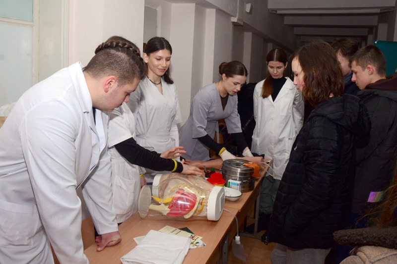 Так, на майстер-класах учні дізналися про ін’єкційне введення препаратів, вимірювання артеріального тиску, зупинку кровотечі, накладання турнікетів, проведені заняття з тактичної медицини та невідкладних станів тощо. Також юнаки і дівчата завітали до навчального музею кафедри та познайомилися з сучасними технологіями викладання анатомії.