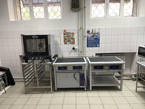 Напередодні була побудована спеціальна траса електромережі, до якої підключено сучасне функціонально-професійне кухонне обладнання у складі трьох промислових кухонних плит для швидкого приготування гарячого харчування для пацієнтів клініки.