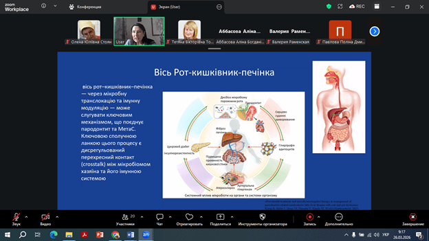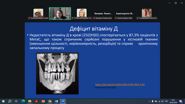 26 березня на кафедрі стоматології в рамках викладання вибіркової дисципліни «Синдроми та симптоми в стоматології» для здобувачів освіти IV курсу стоматологічного факультету відбулася гостьова лекція на тему «Метаболічний синдром та здоров’я порожнини рота: комплексний підхід до ведення пацієнтів», яка викликала значний інтерес серед студентів та стала важливим кроком у поглибленні їхніх міждисциплінарних знань.