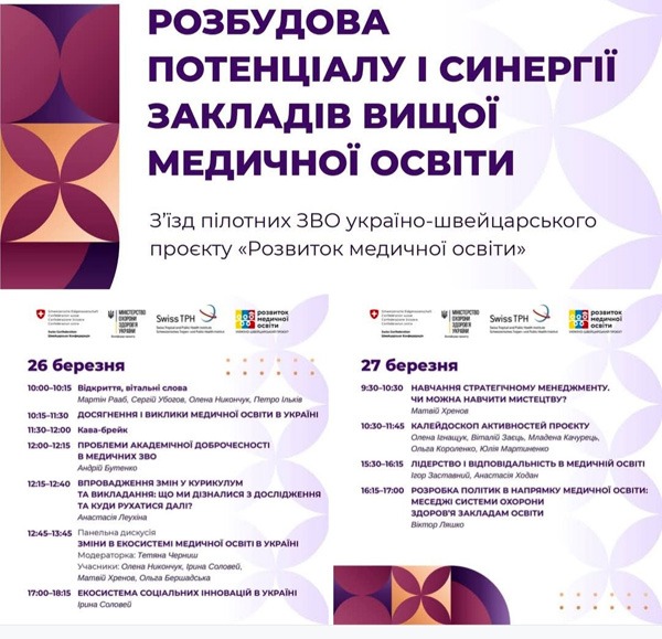 26–27 березня 2026 року в м. Київ відбувся з’їзд пілотних закладів вищої освіти – учасників Україно-швейцарського проєкту «Розвиток медичної освіти», присвячений питанням розбудови потенціалу та посилення взаємодії між закладами.