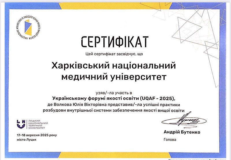 Під час Українського форуму якості освіти UQAF-2025 на презентації кращих практик за напрямком «Як освіта реагує на виклики війни» завідувачка кафедри медицини катастроф та військової медицини Юлія Волкова представила результати 2-річної роботи Навчально-тренувального центру тактичної медицини ХНМУ.