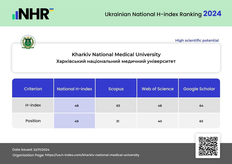 𝐔𝐤𝐫𝐚𝐢𝐧𝐢𝐚𝐧 𝐍𝐚𝐭𝐢𝐨𝐧𝐚𝐥 𝐇-𝐢𝐧𝐝𝐞𝐱 𝐑𝐚𝐧𝐤𝐢𝐧𝐠 оновлено за 4-й квартал 2024 року. Харківський національний медичний університет тримає позиції у топ-20 рейтингу вишів України на основі консолідованого показника індексу Гірша. Загалом було проаналізовано дослідницьку діяльність понад 400 наукових організацій України.