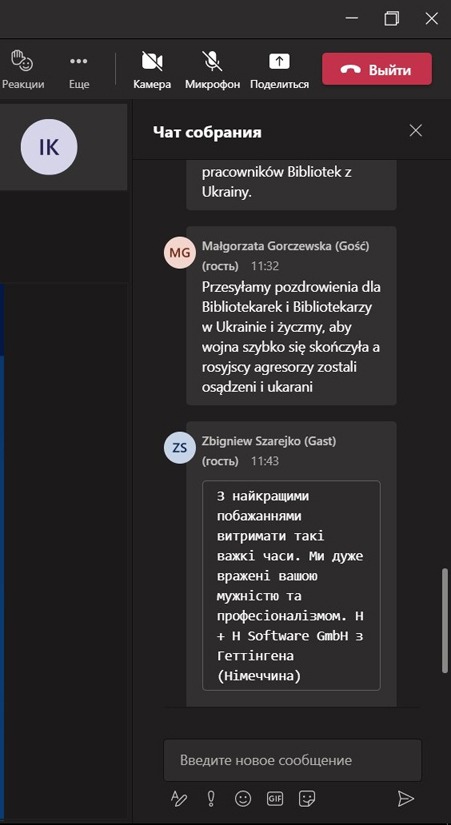 Наукову бібліотеку нашого університету представляла її директорка Ірина Киричок з доповіддю «Наукова бібліотека Харківського національного медичного університету у подоланні викликів пандемії COVID-19 та воєнного стану». Пані Ірина розповіла про досвід в організації роботи бібліотеки під час пандемії коронавірусу, коли університет оперативно перейшов на дистанційну форму навчання та роботи, розширення бібліотечних дистанційних сервісів та онлайн-комунікацій з користувачами, а також висвітлила діяльність під час російської воєнної агресії проти України в реаліях прифронтового Харкова.