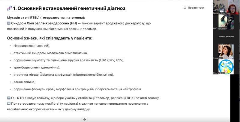 Майстер-клас включав в себе аналіз клінічних лабораторних молекулярно-генетичних даних конкретних пацієнтів, які мали довгий шлях від першого звернення до лікаря до отримання точного діагнозу – від 5 до 15 років. Лікарі працювали із використанням не тільки досвіду колективу і сучасного світового досвіду, а із залученням комп’ютерних технологій, у тому числі ШІ, який був використаний для перевірки вірності та відповідності встановленого діагнозу. Опанування ШІ як складової діагностичного процесу генетиками Харківщини показали його ефективність, але тільки разом із лікарською майстерністю та іншими сучасними методами дослідження.
