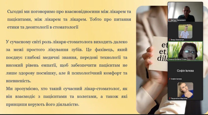 Викладачі кафедри стоматології ННІПО поділилися практичними кейсами щодо необхідності дотримання принципів колегіальності, психологічної підготовки пацієнта до стоматологічного втручання та важливості емпатії. Особливу увагу приділили питанням медичної таємниці, інформованої згоди та дотримання норм професійної честі, що детально висвітлено у Кодексі етики лікаря України. Також розглянули алгоритми дій у складних клінічних ситуаціях, де етичний вибір викладача та лікаря є визначальним.