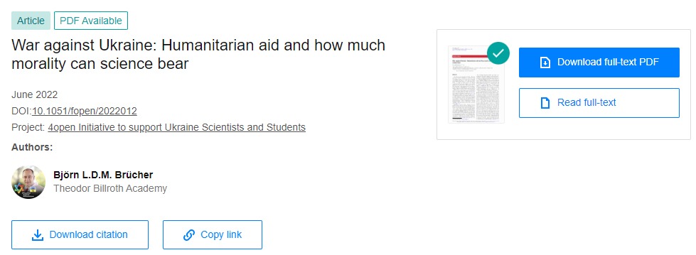 17 червня цього року професор Björn Brücher опублікував статтю в журналі 4open «Війна проти України: гуманітарна допомога і скільки моралі може винести наука» про співпрацю з науковцями України та гуманітарну допомогу нашій країні.
