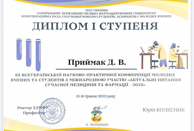 15–16 травня 2025 р. студентка ІІ медичного факультету Дарина Приймак взяла участь у 85-й Всеукраїнській науково-практичній конференції молодих учених та студентів з міжнародною участю «Актуальні питання сучасної медицини та фармації–2025», яка проходила на базі Запорізького державного медико-фармацевтичного університету.