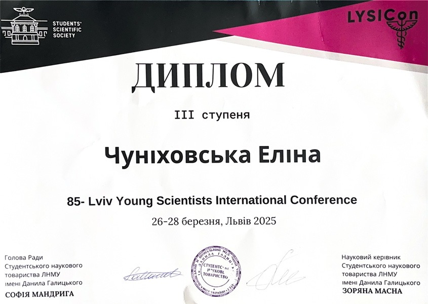 26–28 березня 2025 р. студентка V курсу ІІІ факультету Еліна Чуніховська взяла участь у 85-й Загальноуніверситетській науковій конференції студентів та молодих учених/Lviv Young Scientist International Conference (85LYSICon), яка проходила на базі Львівського національного медичного університету ім. Данила Галицького.