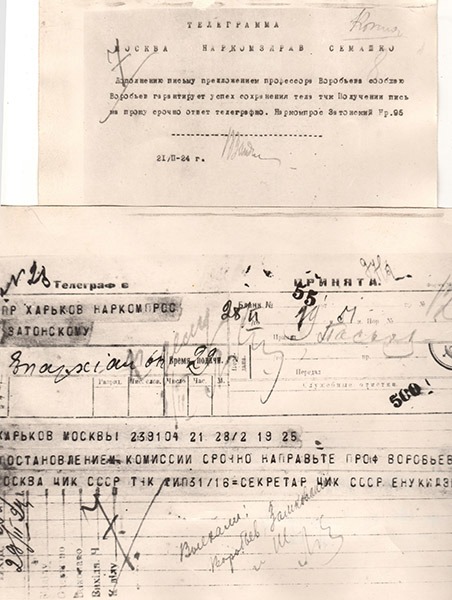 Присутні наполягали, щоб Воробйов повідомив до Москви про можливу участь у бальзамуванні, але він відмовився. Тоді В.П. Затонський, який був на той час наркомом освіти УРСР, повідомив голову комісії з організації похорону В.І. Леніна, що професор Воробйов гарантує успіх збереження тіла. Слідом за цим до Харкова прийшла телеграма від уряду з пропозицією В.П. Воробйову негайно прибути до Москви. (Фотокопії телеграм зберігаються у музеї історії ХНМУ).