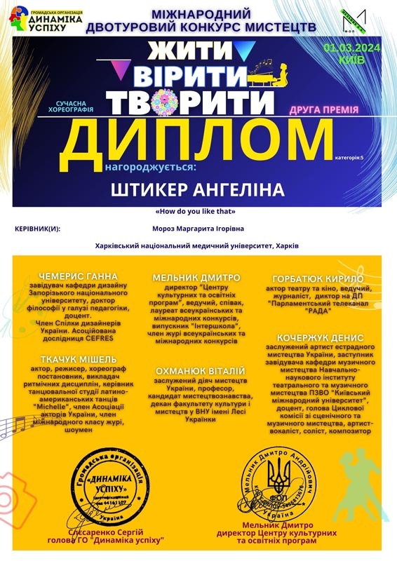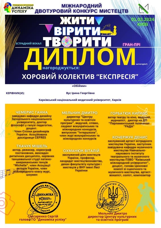 У березні місяці вокальні та танцювальні колективи ХНМУ взяли участь у Міжнародних фестивалях-конкурсах мистецтв та отримали такі здобутки: