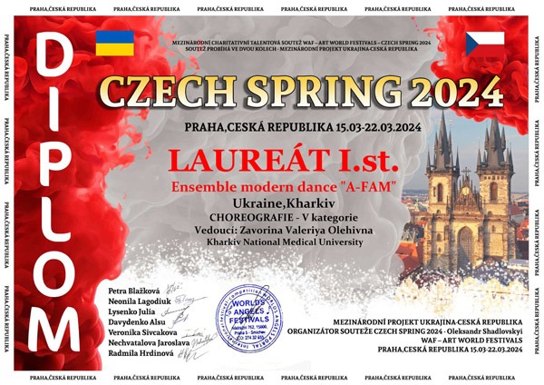 - Міжнародний двотуровий благодійний конкурс мистецтв «Czech spring 2024» (Прага, Чехія) – ансамбль сучасного танцю «A-FAM», солістка народної аматорської вокальної студії «Каданс» Марина Цимбал, а також народний аматорський колектив профспілок України ансамбль народного танцю «Радість» вибороли нагороди за 1-е місце.