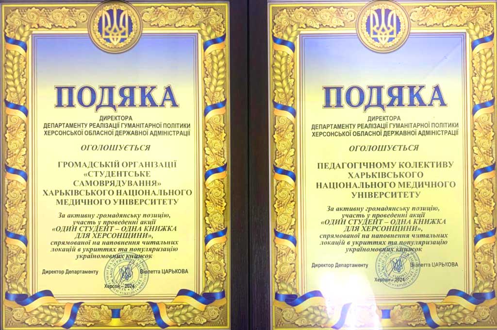 На адресу ХНМУ надійшла подяка від директора департаменту реалізації гуманітарної політики Херсонської обласної державної адміністрації для спільноти нашого вишу. Співробітники та здобувачі вищої освіти медичного вишу за підтримки ГО «Студентське самоврядування ХНМУ» та Профспілкової організації ХНМУ приєдналися до Всеукраїнського проєкту «Вільні читають українською».