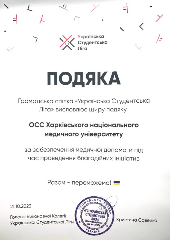 На імʼя Студентського самоврядування ХНМУ надійшла подяка від громадської спілки «Українська студентська ліга» за забезпечення медичної допомоги під час проведення благодійних ініціатив у вигляді благодійного турніру з міні-футболу USL SCC 14.