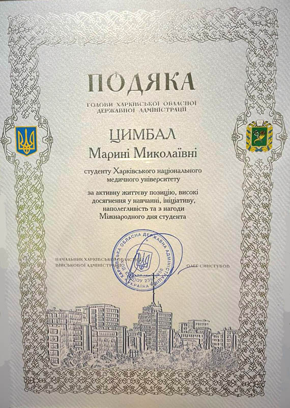 Під час урочистого заходу студентка ХНМУ Марина Цимбал отримала подяку начальника ХОВА за активну життєву позицію, високі досягнення у навчанні, ініціативу та наполегливість, а також з нагоди Міжнародного дня студента.