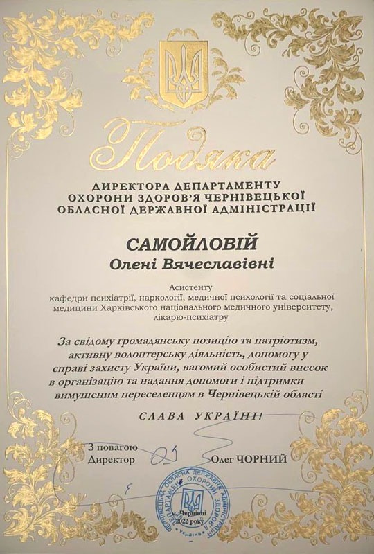 Директор Департаменту охорони здоров’я Чернівецької обласної військової адміністрації Олег Чорний вручив асистенту кафедри психіатрії, наркології, медичної психології та соціальної медицини ХНМУ, лікарю-психіатру Олені Самойловій Подяку за свідому громадянську позицію та патріотизм, активну волонтерську діяльність, допомогу у справі захисту України, вагомий особистий внесок в організацію та надання допомоги і підтримки вимушеним переселенцям в Чернівецькій області.