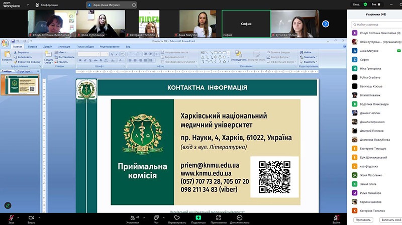 10 березня 2025 року у рамках договору між кафедрою медичної та біоорганічної хімії ХНМУ і комунальним закладом «Харківський ліцей № 49 Харківської міської ради» в дистанційному форматі проведено зустріч викладачів кафедри Світлани Козуб і Олени Савєльєвої та голови студентського самоврядування Катерини Тополюк із ліцеїстами 9–10 класів.