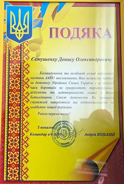 Командування та особовий склад військової частини А4891 висловлюють подяку Денису Євтушенку за допомогу Збройним силам України у боротьбі за суверенітет, територіальну цілісність та недоторканність країни, а також за проявлений патріотизм та відповідальність за майбутнє держави.