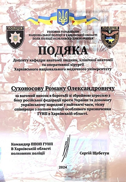 Від Головного управління Національної поліції в Харківській області надійшла Подяка доценту кафедри анатомії людини, клінічної анатомії та оперативної хірургії за вагомий внесок в боротьбі зі збройною агресією з боку російської федерації проти України на допомогу українському народові у найтяжчі часи та тісну співпрацю з полком поліції особливого призначення ГУНП в Харківській області.