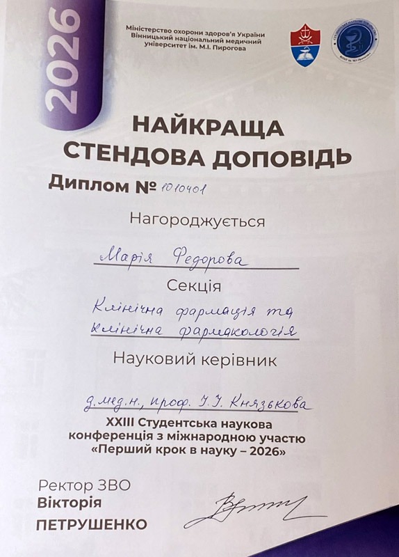 Вітаємо студентку І медичного факультету Марію Федорову з успішною участю у XXIII Студентській науковій конференції з міжнародною участю «Перший крок в науку – 2026».
