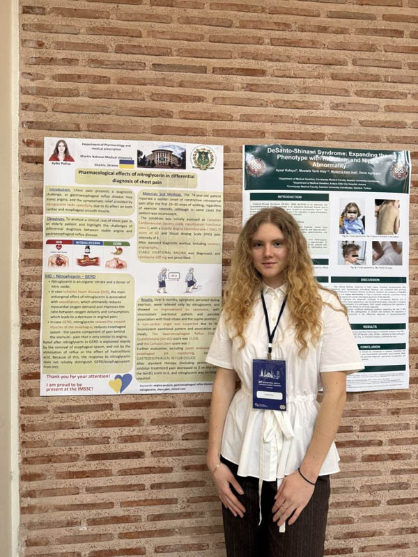 У рамках заходу вона представила постерну доповідь на тему: «Фармакологічні ефекти нітрогліцерину в диференціальній діагностиці ретростернального болю». Роботу виконано на кафедрі фармакології та медичної рецептури під керівництвом в.о. завідувачки кафедри Інни Дунаєвої та асистентки Олени Паутіної.