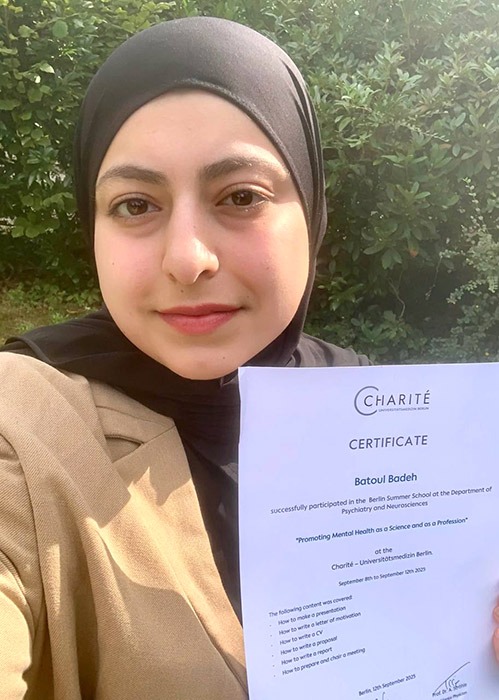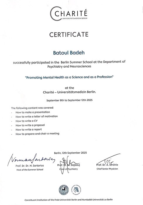 Студентка другого курсу першого (бакалаврського) рівня вищої освіти спеціальності «Психологія» Батуль Бадех взяла участь у Берлінській літній школі «Навички для наук та професій у галузі психічного здоров’я», що проходила у кампусі Charité Campus Mitte (Берлін) з 7 вересня по 12 вересня 2025 року.