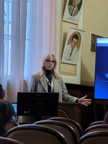 У секції «Медицина в умовах війни» Софія Коліна презентувала доповідь «Досвід практичного застосування інтерактивного анатомічного столу “Anatomage table” при підготовці майбутніх лікарів в умовах війни» (науковий керівник – доцент Роман Сухоносов).