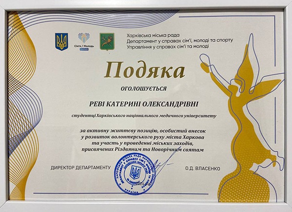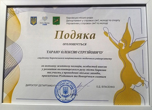 За активну громадянську позицію, особистий внесок у розвиток волонтерського руху міста Харкова та участь у проведенні міських заходів директор департаменту сімʼї, молоді та спорту Харківської міської ради Олександр Власенко нагородив подяками наших здобувачів освіти – студентів ІІ медичного факультету Катерину Реву та Олексія Тарана.