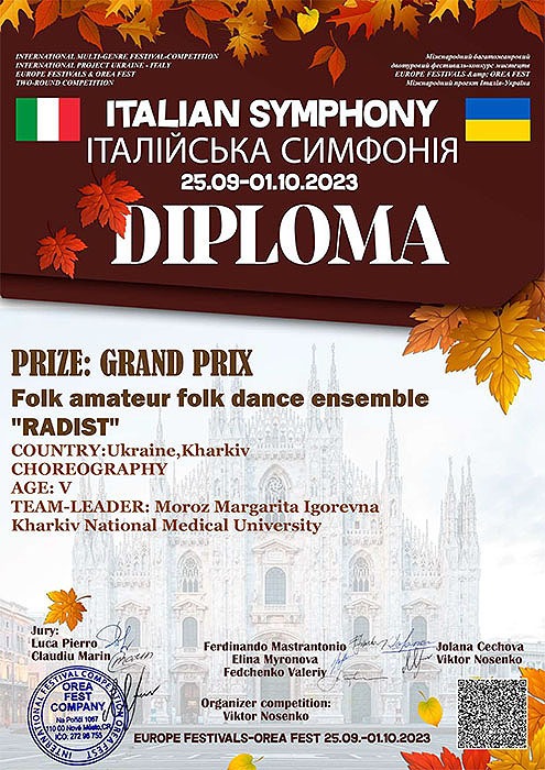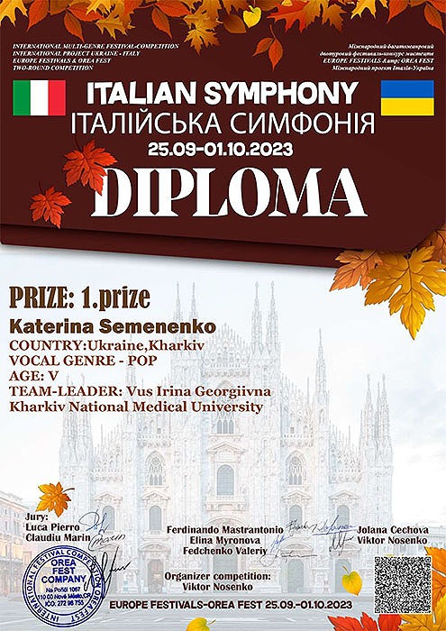З 25 вересня по 1 жовтня відбувався Міжнародний багатожанровий двотуровий дистанційний фестиваль-конкурс мистецтв «Італійська симфонія» та міжнародний проєкт Італія-Україна, в якому взяли участь 266 учасників з усієї країни, а також з Китаю, Азейбарджану, Польщі та Молдови.