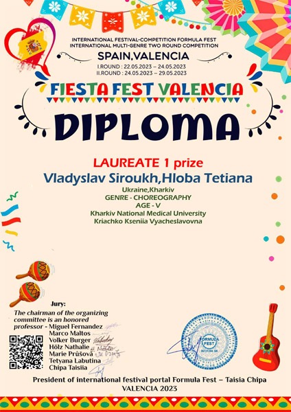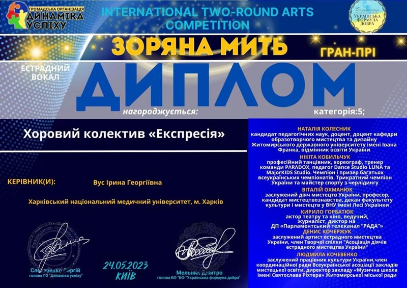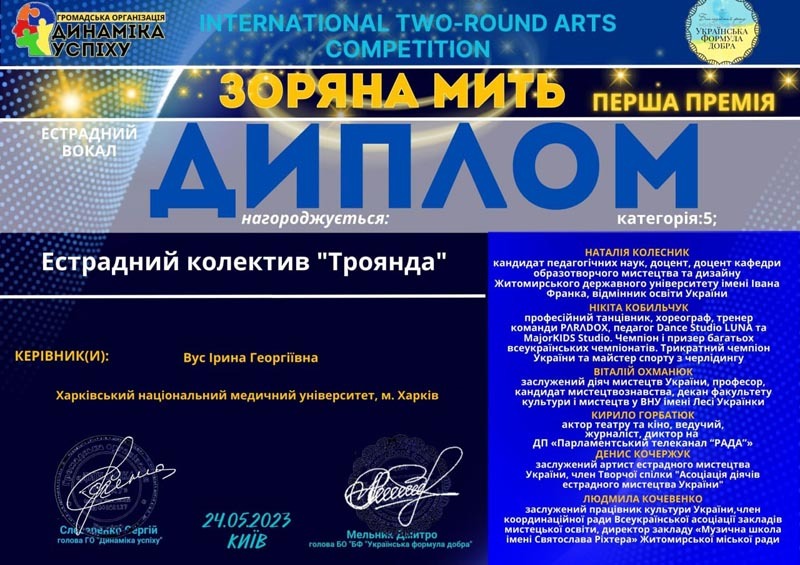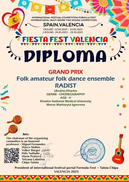 25 та 29 травня пройшли Міжнародні дистанційні фестивалі-конкурси мистецтв у м. Прага (Чехія) та м. Валенсія (Іспанія), де серед великої кількості учасників з різних країн ансамбль «Радість» отримали перемогу і нагороду фестивалю ґран-прі та диплом за І місце, а також дует. який складається зі студентів IV медичного факультету Владислава Сіроух та Тетяни Глоба – солістів ансамблю бального танцю «Art-dance», отримали диплом лауреата 1 ступеня.