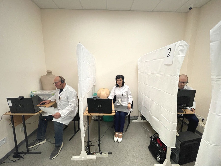 Треба зазначити, що проведення іспиту суворо регламентовано. Так, група студентів з 10 осіб заходять одночасно на іспит і проходять відповідно 10 станцій, перехід між якими становить одну хвилину, а перебування на кожній окремо – 10 хв. Потім здобувачі змінюють станції, які працюють за такими напрямками, як терапія, хірургія, педіатрія, акушерство та гінекологія, медицина надзвичайних станів. Під час екзамену відбувається візуалізація пацієнта, манекена або безпосередньо завдання, що пов’язано з умовним пацієнтом. Обробка результатів усіх етапів здійснюється за допомогою спеціально розробленої комп’ютерної програми.