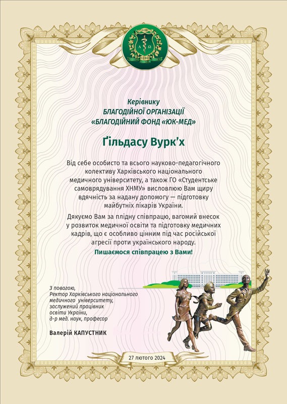 Зважаючи на рівень наданої допомоги у підготовці майбутніх лікарів, ректор Харківського національного медичного університету Валерій Капустник висловив щиру вдячність керівнику Благодійної організації «Благодійний фонд «ЮК-МЕД» Ґільдасу Вуркʼх за плідну співпрацю та вагомий внесок у розвиток медичної освіти і підготовку медичних кадрів, що є особливо цінним під час російської агресії проти українського народу.