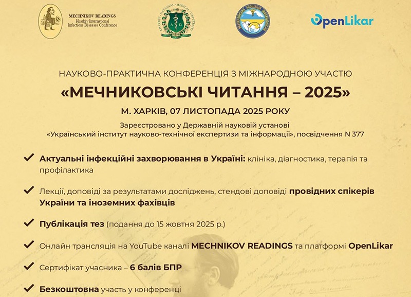 Запрошуємо Вас взяти участь у роботі науково-практичної конференції з міжнародною участю «МЕЧНИКОВСЬКІ ЧИТАННЯ – 2025», яка відбудеться 7 листопада 2025 року. Детальнішу інформацію можна дізнатися в Інформлисті.
