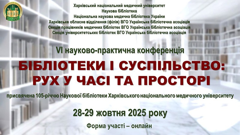 28–29 жовтня 2025 р. відбулась VІ науково-практична конференція «Бібліотеки і суспільство: рух у часі та просторі», присвячена 105-річчю Наукової бібліотеки Харківського національного медичного університету.