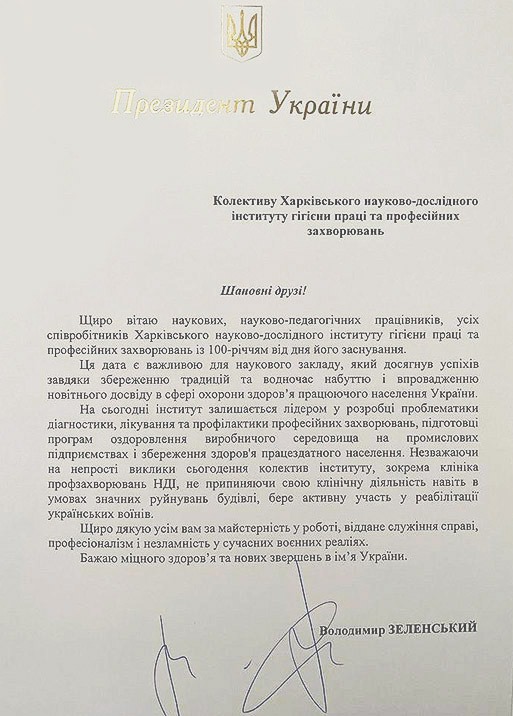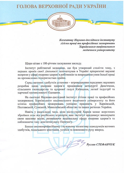 До вітальних промов приєднався ректор Харківського національного медичного університету Валерій Капустник. «Сьогодні багато разів буде звучати слово «вперше», адже в 1923 році в Україні і в нашому місті дійсно вперше був створений Інститут робітничої медицини. Увесь цей час колектив закладу стояв на рубежі вирішення завдань медицини праці, наразі, будучи підрозділом нашого університету, він зберігає свій статус і продовжує навчати студентів, лікувати хворих з професійними хворобами, працювати із хворими на Covid, співпрацювати з військовими шпиталю Північного регіону з питань підвищення кваліфікації особового складу тощо», – зазначив керівник медичного вишу. Валерій Андрійович побажав трудовому колективу Інституту успіхів у важливій діяльності збереження здоров’я працюючої людини та в подальшому розвитку медицини праці.