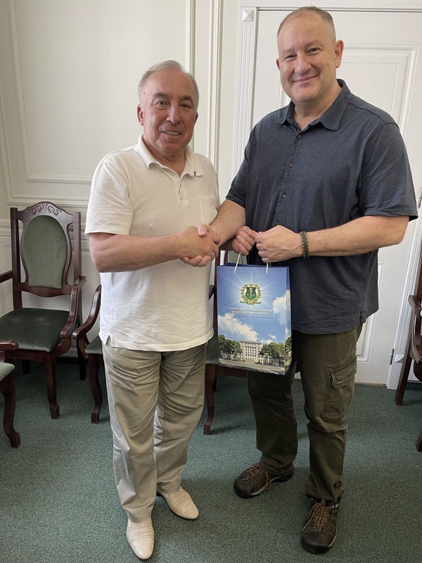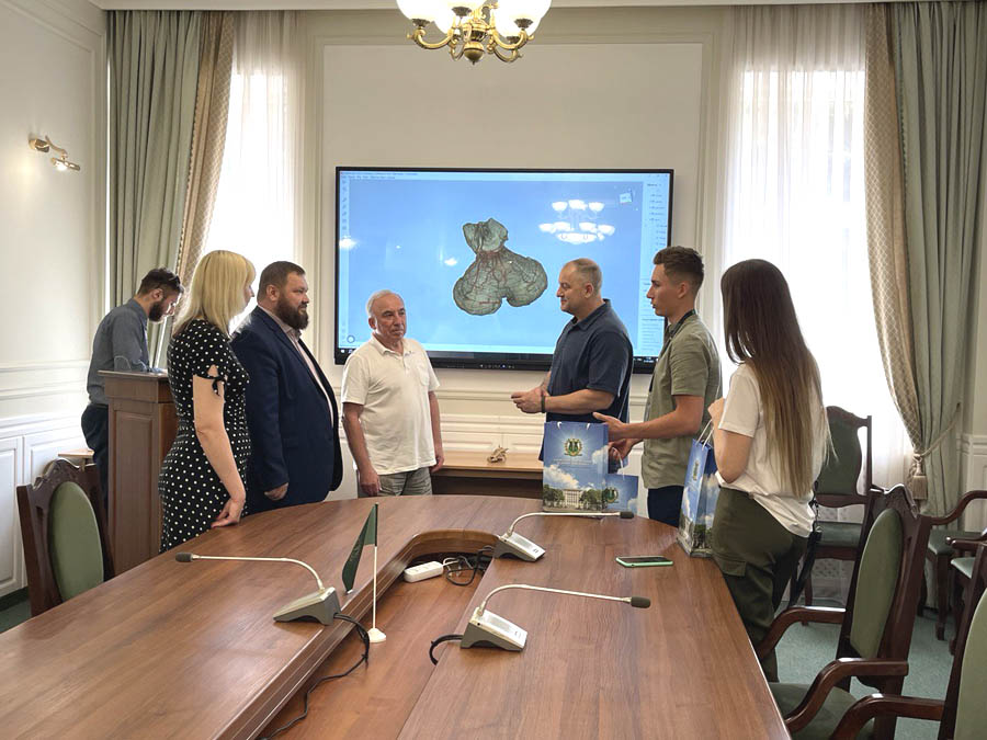 Гостей привітав проректор з науково-педагогічної роботи Володимир Марковський, який зазначив, що питання протезування і реабілітації дуже актуальні для нас, особливо в умовах війни. Директор Центру тривимірних технологій Денис Шиян відзначив значущість місії Люка Калхуна як військового з 25-річним досвідом, який прийняв рішення про благодійну допомогу нашій країні у скрутний для неї час. Пан Денис зазначив, що ХНМУ єдиний навчальний заклад, який має у своїй структурі 3D-центр. Виш першим почав впроваджувати інноваційні технології і вдало поєднав їх з медициною і навчанням. Гостям були продемонстровані можливості наших сканерів, а також озвучені потреби для подальшого розвитку Центру.