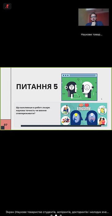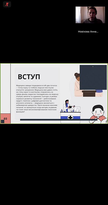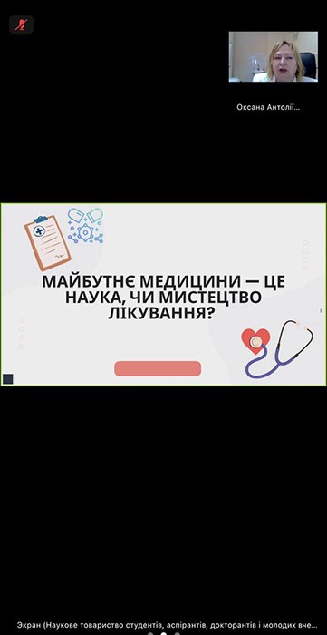 З вітальним словом до учасників звернулася в.о. проректора з наукової роботи Оксана Наконечна, яка підкреслила: «Медицина — це унікальне поєднання точних наук і людяності. Сьогоднішня дискусія — це не просто обмін думками, а формування розуміння того, що майбутнє лікаря лежить на стику наукових знань і мистецтва спілкування з пацієнтом. Критичне мислення та вміння вести діалог — це ті навички, які допоможуть вам стати не лише професіоналами, а й справжніми творцями майбутньої медицини».