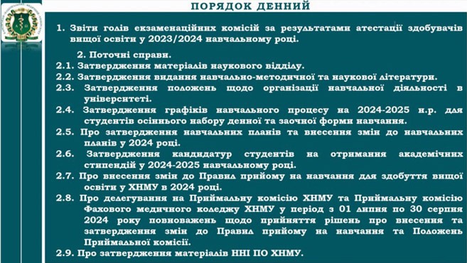 28 червня 2024 р. відбулося засідання Вченої ради Харківського національного медичного університету в дистанційному форматі під головуванням Володимира Лісового.