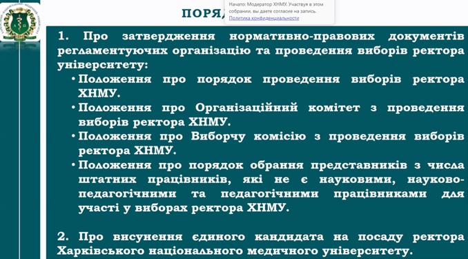 На початку засідання директор ННІ ЯО Ігор Завгородній представив нормативно-правові документи для затвердження, а саме: «Положення про порядок проведення виборів ректора ХНМУ», «Положення про Організаційний комітет з проведення виборів ректора ХНМУ», «Положення про Виборчу комісію з проведення виборів ректора ХНМУ», «Положення про порядок обрання представників з числа штатних працівників, які не є науковими, науково-педагогічними та педагогічними працівниками для участі у виборах ректора ХНМУ».