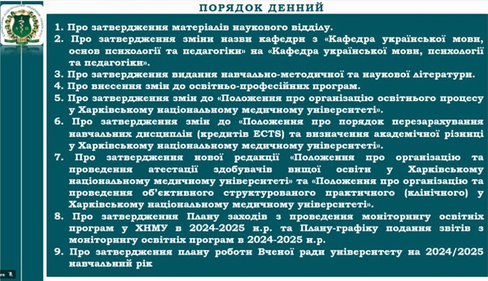 28 серпня 2024 р. відбулося засідання Вченої ради Харківського національного медичного університету під головуванням Володимира Лісового в дистанційному форматі.