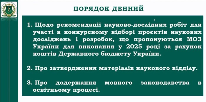 На порядку денному розглянуто питання щодо рекомендації науково-дослідних робіт для участі у конкурсному відборі проєктів наукових досліджень і розробок, що пропонуються МОЗ України для виконання у 2025 р. за рахунок коштів Державного бюджету України, затверджено матеріали наукового відділу, а також обговорено поточні справи.
