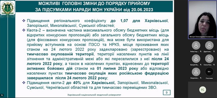 На порядку денному розглядалося питання стосовно внесення змін до Правил прийому на навчання для здобуття вищої освіти у ХНМУ в 2023 році (доповідачка: заступниця відповідального секретаря Приймальної комісії ХНМУ Вікторія Головачова).