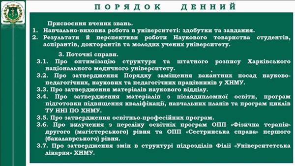 19 червня 2025 р. Харківський національний медичний університет провів засідання Вченої ради у дистанційному форматі. На порядку денному – актуальні питання навчально-виховної роботи та діяльності Наукового товариства студентів, аспірантів, докторантів і молодих учених.
