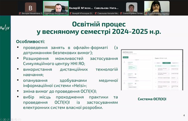 У доповіді він охарактеризував освітній процес у весняному семестрі, використання дистанційних технологій, цифровізацію та симуляційні методи навчання. Було висвітлено питання практичної підготовки здобувачів освіти, міжнародної діяльності, додаткової освіти у ХНМУ. Також були представлені показники підсумкової успішності та результати складання випускних іспитів. О. Кривошапка звернув увагу на внутрішнє й зовнішнє забезпечення якості освіти та представив план акредитацій на 2025/2026 навчальний рік.